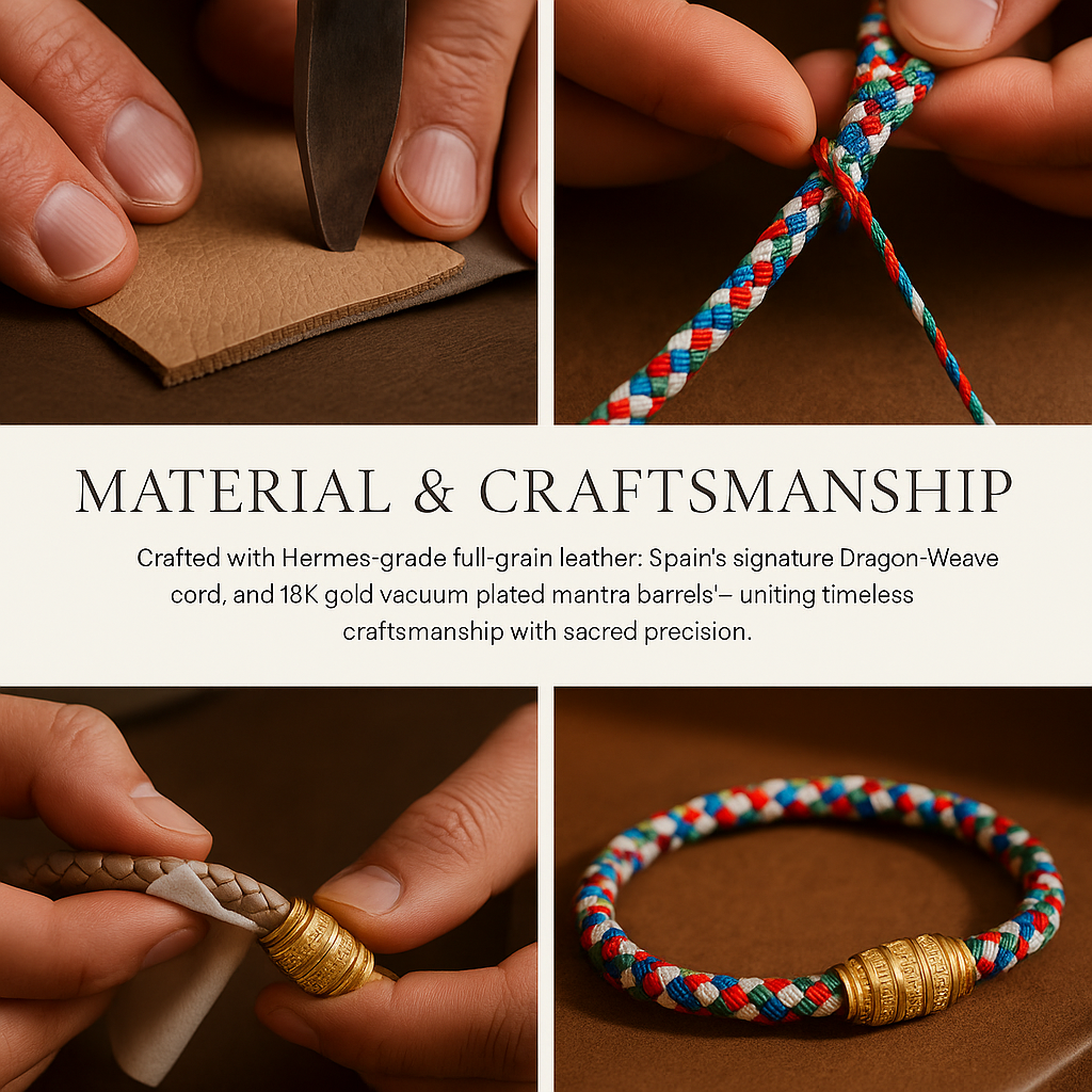 Our bracelets are crafted with two signature bands — Hermès-grade full-grain leather and the hand-braided Dragon-Weave cord, exclusively made in Spain.